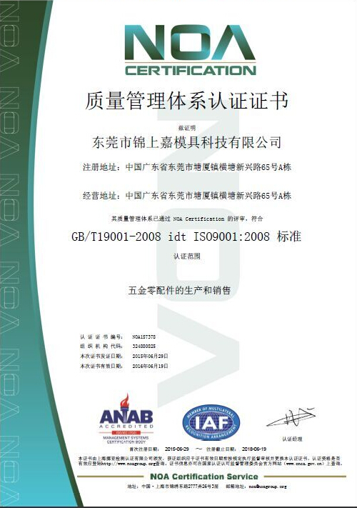 質量管理體係認證證書_東莞市錦上嘉模具科技有限公司